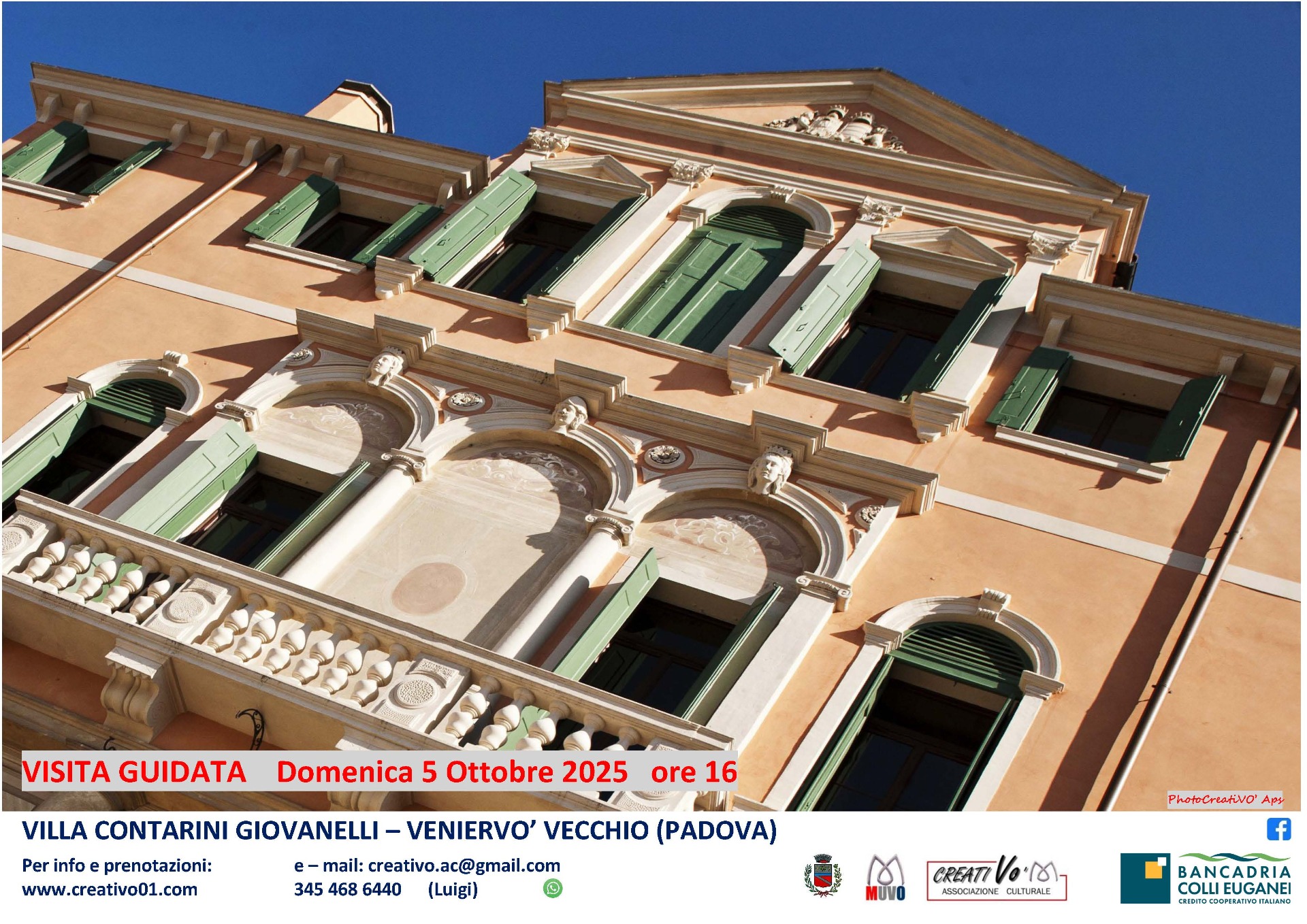 Necessaria la prenotazione. Per la visita guidata il punto d'incontro è davanti alla biglietteria di Villa Contarini Giovanelli Venier, dove si pagherà il biglietto d'ingresso. Consigliamo di arrivare 10 minuti prima dell'inizio della visita per il disbrigo delle formalità. – Prezzo 5 €uro (gratuito per disabili e accompagnatore e bambini fino a 12 anni).